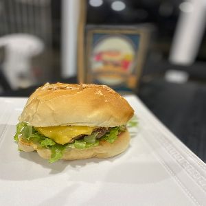 pão redondo francês, hambúrguer 150 g artesanal, maionese da casa, queijo prato.