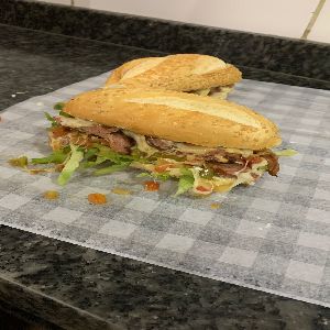 baguete, contra filé, vinagrete, mussarela, maionese grill e alface